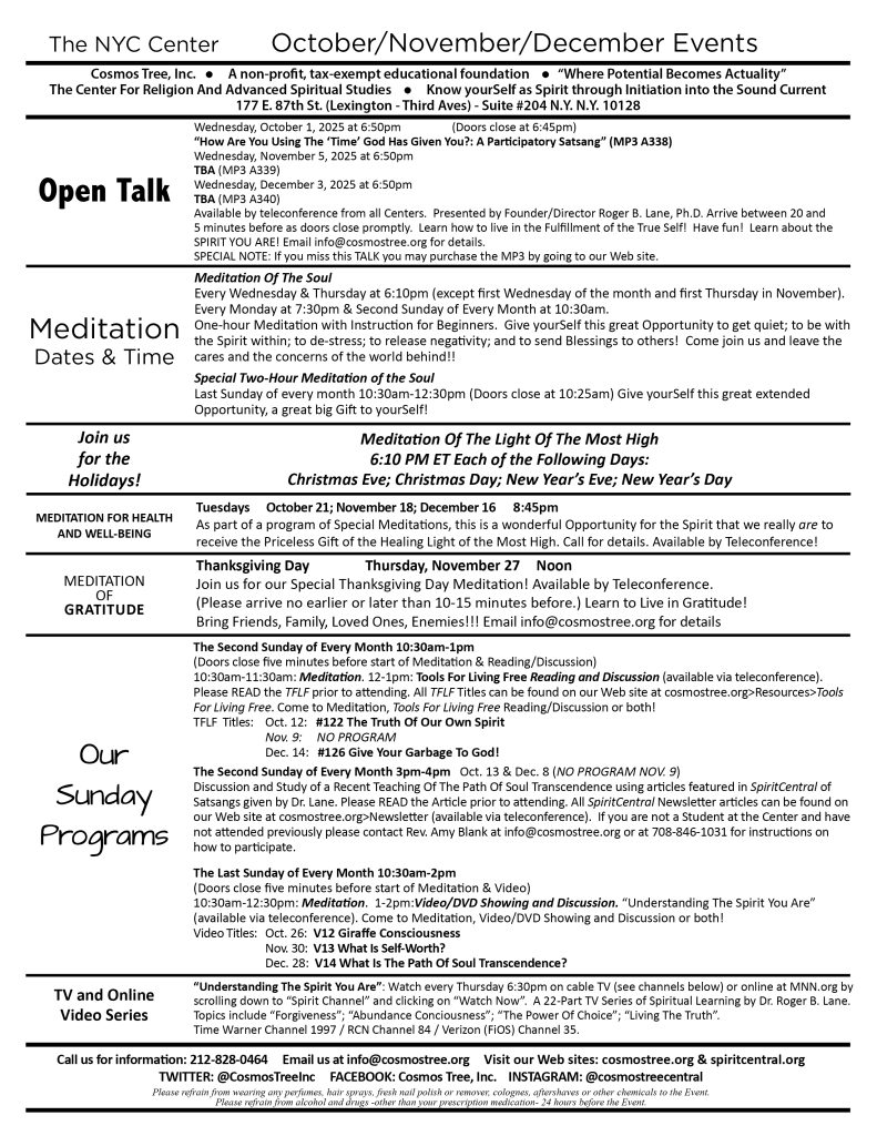 Cosmos Tree has a full Calendar of Events, including Meditations; Monthly Talks (Satsang); Open Hours where individuals receive help in their lives from a Spiritual Perspective; Classes and Workshops that are set up by Semester; national and international Speaking Tours and more.